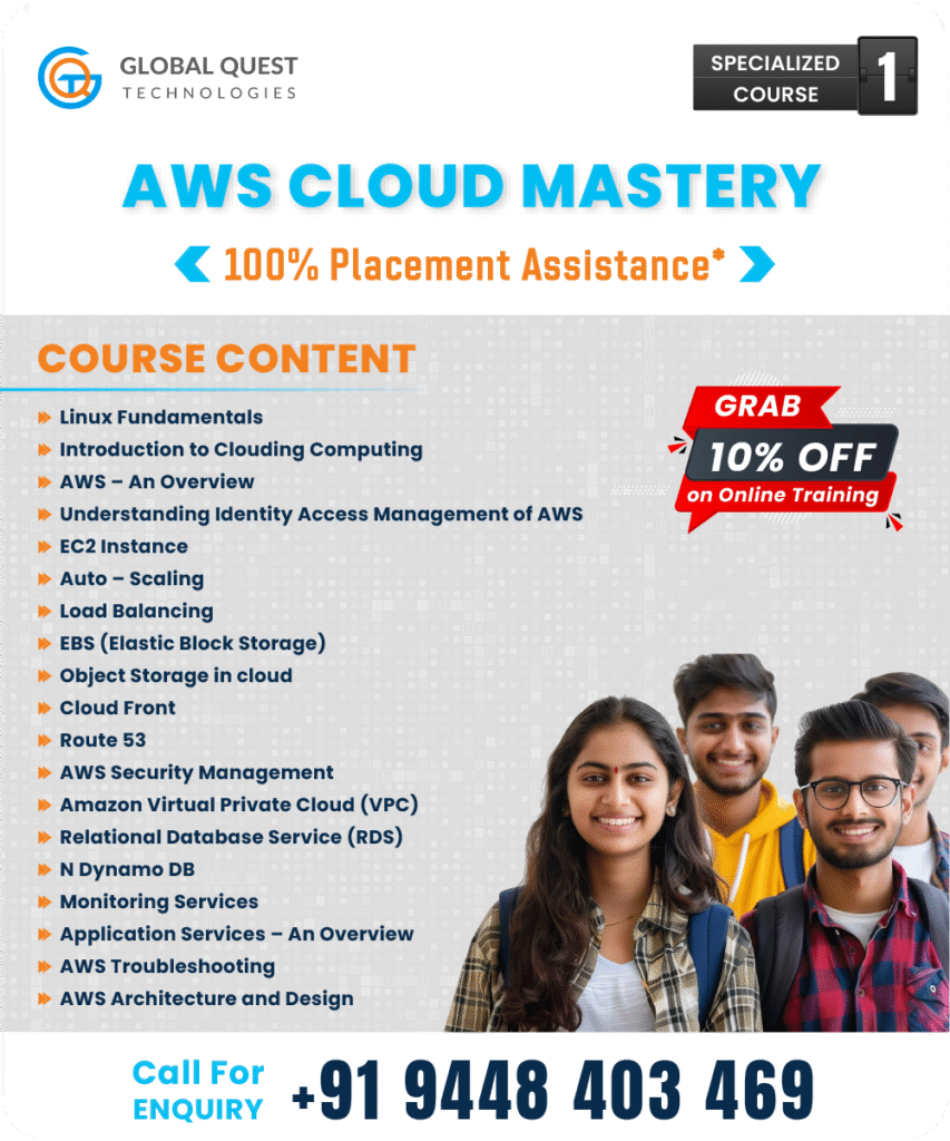 The Amazon Web Services course by Global Quest Technologies is especially designed to acquaint the individuals from the very root of software development to the practical applications of it. The students get complete guidance not only for clarifying course-related doubts but also regarding the preparation for placements.