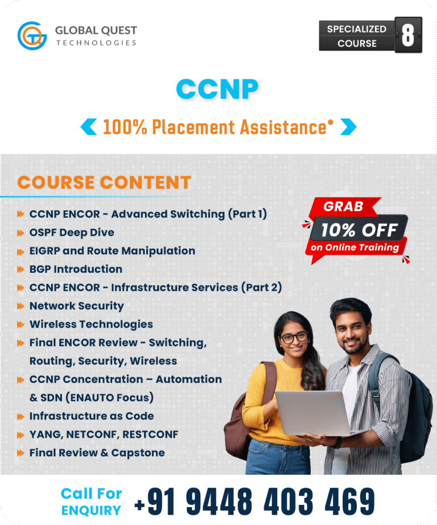 Our institute provides specialized CCNP training with a focus on real-world networking skills. Learn advanced routing, switching, and security through hands-on labs and expert guidance. With personalized support and industry-focused learning, we ensure you’re prepared for a successful career in networking.