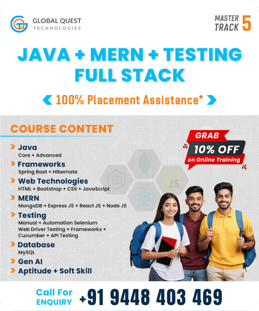 Master Track-5 at GQT is a 6-months program covering Java Full Stack, MERN Stack, and Software Testing. Gain hands-on experience with key technologies like Java, Spring Boot, React, Node.js, and Selenium. With expert mentorship and placement support, this course is perfect for those seeking a career in full-stack development and testing.