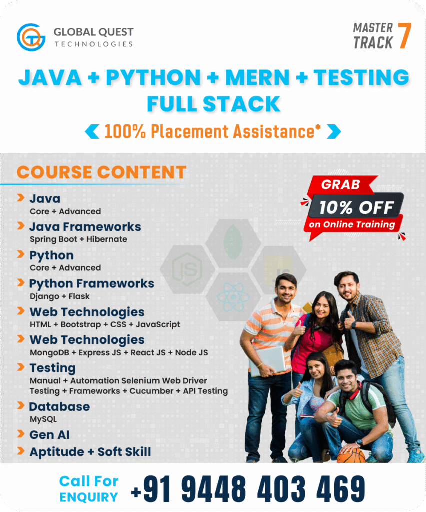 Master Track-7 at GQT offers a comprehensive 6-month program covering Java, Python, MERN Stack, Full Stack Development, Testing, and Aptitude. Gain hands-on experience with real-world projects, master problem-solving skills, and enhance your soft skills. With expert mentorship, personalized guidance, and dedicated placement support, this program ensures you’re fully equipped for success in the competitive IT industry.