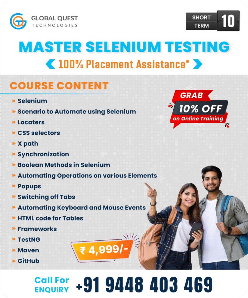 Our institute offers industry-focused Selenium automation training, equipping you with essential skills in test automation, script writing, and debugging. With hands-on projects, expert mentorship, and real-time case studies, we ensure you gain practical experience to excel in software testing. This course prepares you for high-demand roles in quality assurance and automation testing.