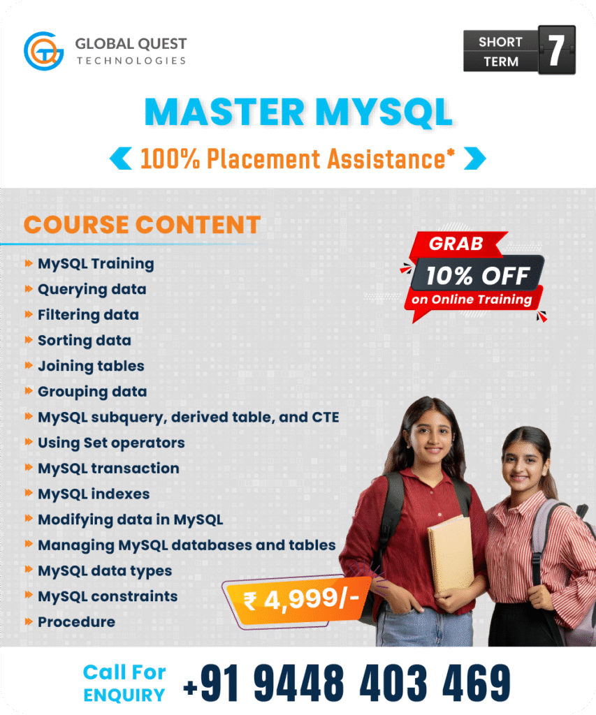 Our institute is dedicated to providing industry-relevant MySQL training, ensuring you gain expertise in database management, optimization, and queries. With a hands-on learning approach, expert mentorship, and real-world projects, this course equips you with the skills needed for careers in web development, data analytics, and backend systems. Our structured curriculum and career support help you stay ahead in the competitive tech industry.